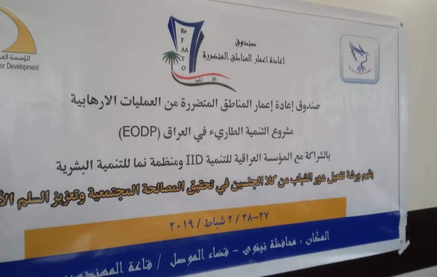 صندوق اعادة اعمار المناطق المتضررة من العمليات الارهابية وبالشراكة مع منظمة نما للتنمية البشرية والمؤسسة العراقية للتنيمة انطلاق اعمال ورشة( تفعيل دور الشباب من كلا الجنسين في تحقيق المصالحة المجتمعية وتعزيز السلم الاهلي) .